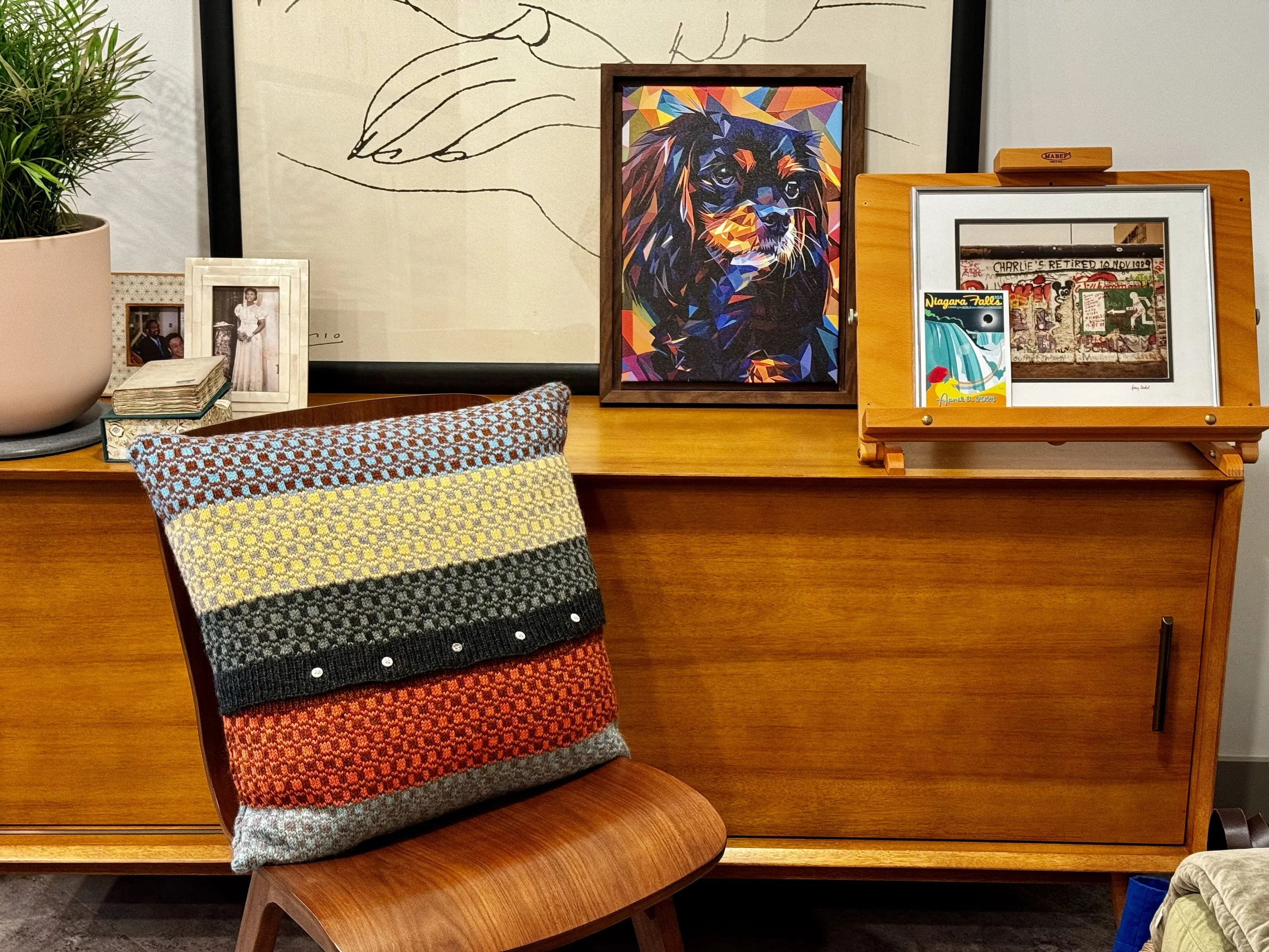 I began with the Butterfly Geo Cushion in early 2024 (completed in May of that year), but it was a slow process. I am a notoriously slow knitter, partly because my multiple sclerosis causes cramping in my right hand from time to time, partly because I’m easily distracted by shiny new projects. But the length of time had nothing to do with the pattern itself, which kept me interested throughout. As you can tell from the pictures, aside from the ribbed banding with the button enclosure, you are almost always working with two colors per row, following the chart closely and watching these gorgeous geometric color combinations magically unfold. The rhythmic was meditative and perfect for evening post-work knitting sessions.